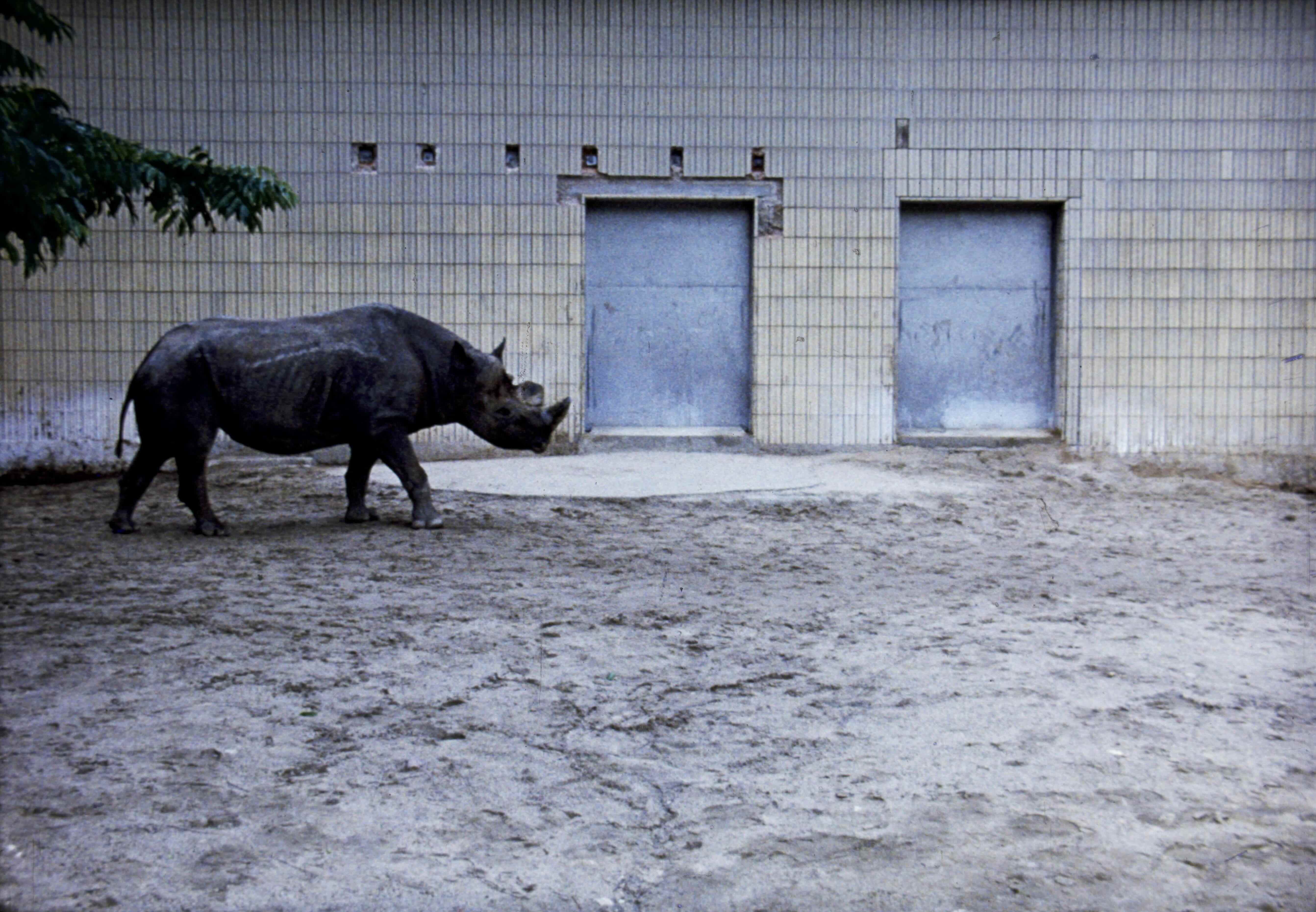 Kels observed and filmed rhinoceroses (Rhinoceros [1987], Cage [2009]), hippopotamuses, and elephants (the eponymous films from 1993 and 2001 respectively) in the zoos he frequented over many years. The rhinoceros films were structured using metric montage, borrowing its operative principle from the musical notion of metre. By employing variations and repetitions on a precise count of frames, Kels created a staccato rhythm in the editing. In contrast, Hippopotamuses and Elephants subvert the more commonly practiced continuity editing. Taken together, these films attest to Kels’s deep engagement with the history of cinema: the Lumière brothers as recorders and reproducers of events, and Georges Méliès, as a conjurer of fantasies. Having studied under Peter Kubelka at the Städelschule in Frankfurt, Kels was acutely aware of the “magic wand” that is montage. Kubelka, who theorised metric montage, indicated how editing can express meaning not merely as a result of collision between shots, but rather, when carefully utilized, between frames. Operated at the level of frames, montage – rupturing the space-time continuum – is freed from subservience to narrative. Rather than working stealthily, it makes itself apparent. In Rhinoceros, Kels initially filmed a single movement of two rhinoceroses over several days, using a precise camera position on eight separate occasions. This movement was the animals’ movement indoors through a single door at a designated time. A couple of years later, Kels returned to the same scene and discovered that the enclosure now had two doors. Since it was winter, the animals remained indoors, and Kels merely recorded the two closed doors, emulating the camera framing from two years earlier as closely as possible. Later, he had the chance to film one rhinoceros entering through one of the two doors. Armed with these three documentary elements that provided the necessary variation – one door with two rhinos, two doors without rhinos, and one rhino and two doors – Kels edited the footage rhythmically, creating an illusion of spatial consistency on which different temporalities are overlaid. The illusion of always observing the same scene unseparated in time only holds if one does not scrutinise it closely. The markers of time – the foreground of the doors, the colour and texture of its metal, the walls on which they are set, and variations in light – remain visible albeit in a constantly shifting field of vision, openly testifying to the passage of time.