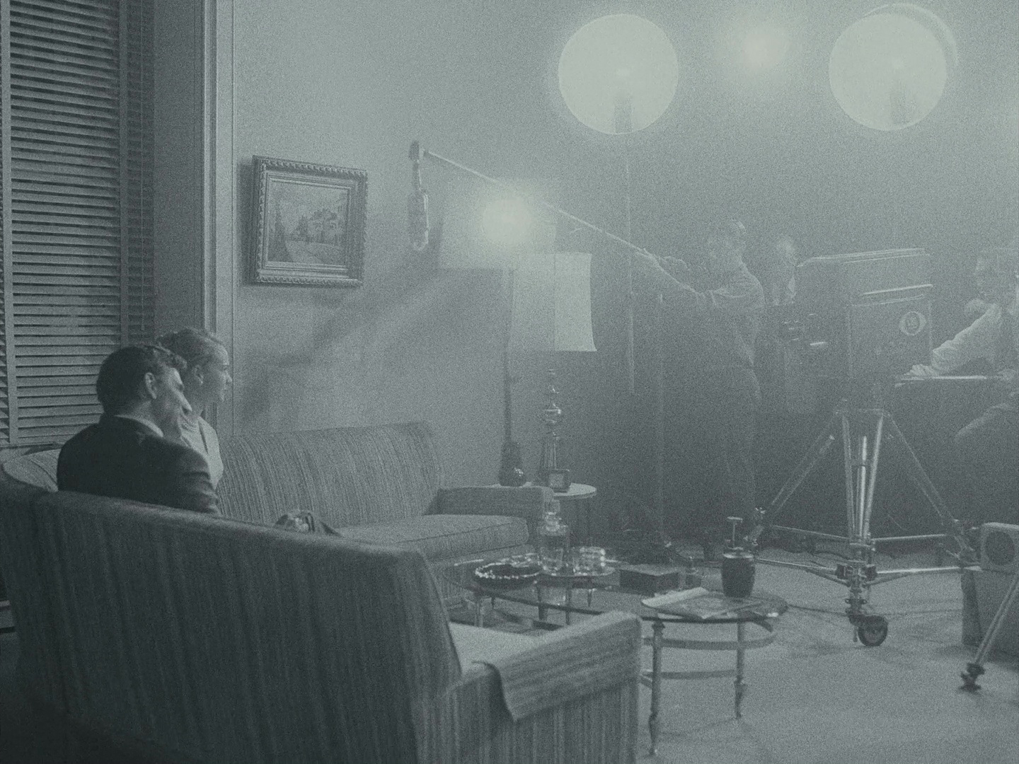 Deze openingsscène van Maestro werpt niet alleen een blik op toekomstige gebeurtenissen, maar laat ook meteen de thematiek van het verhaal doorklinken, zoals Bernsteins turbulente huwelijk met Montealegre en de ingrijpende impact van zijn verzwegen affaires met mannen. Tegelijkertijd maakt de scène ons ook getuige van de fictieve creatie van een beeld. Cooper filmt de geënsceneerde totstandkoming van documentaire beelden en lijkt zo een tipje van de sluier te lichten, alsof hij de illusie meteen wil doorprikken. Hij presenteert ons zijn eigen (gefingeerde) bewijsmateriaal zonder kunstmatige manipulatie, de werkelijkheid achter de schermen zoals ze is. Hier zit Leonard Bernstein die een interview geeft voor de Amerikaanse televisie.