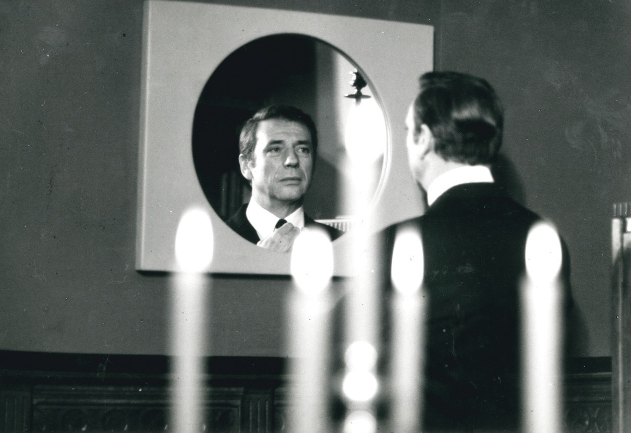 In the film, a conflict is being played out between Mathias (Yves Montand), a Flemish linguist and literature professor, and a theatrical stage designer named Anne (Anouk Aimée) who left France to live with him in Belgium and feels both excluded and scorned by the Flemish members of Mathias’s circle. In the film’s opening scene – after see-through credits launch Delvaux’s first color feature with what looks like a black and white snowy landscape seen from a moving train over a plaintive song about the seasons sung by a woman vocalist (with lyrics by Delvaux) – Mathias is visiting his French-speaking grandmother, who recalls him refusing to go to a cinema with her at the age of ten because he felt ashamed of her, a memory that Mathias diffidently denies and shrugs off (“Mais non!”), suggesting another half-hidden sign of the same syndrome.
